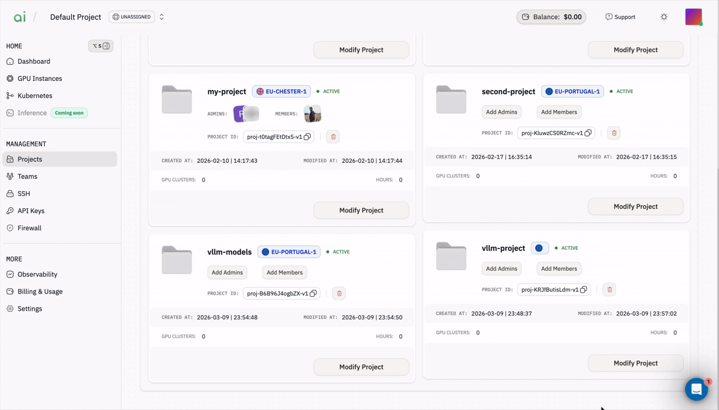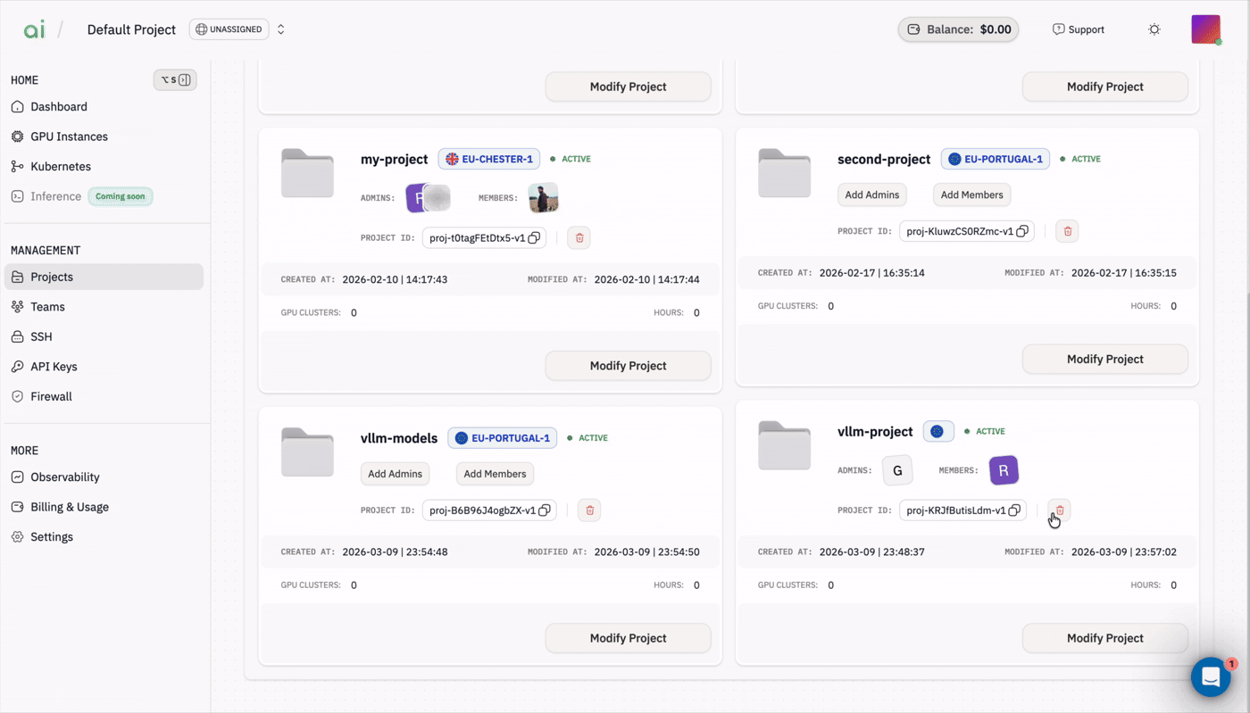 Projects can have admins and members. Admins can manage project settings and access.- On the project card, click