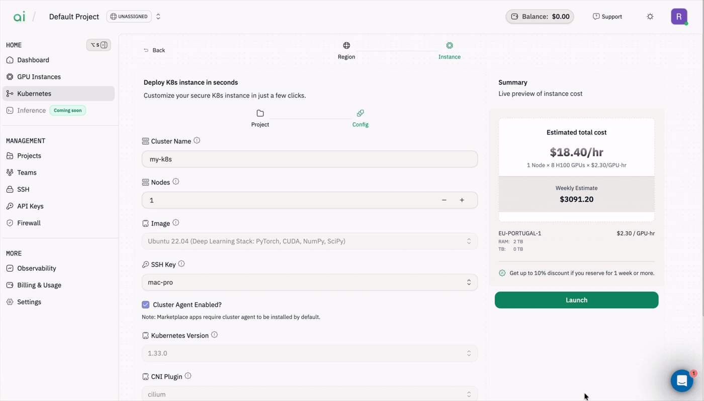 Cluster Name: A friendly name such asmyfirstk8sNodes: Use the – / + controls to set the number of nodesImage: Select a base image (for deep learning stacks this may include PyTorch/CUDA)SSH Key: Select the public key you uploaded earlierKubernetes Version: Choose the desired K8s versionCNI Plugin,Pod CIDR,Service CIDRand other network fields