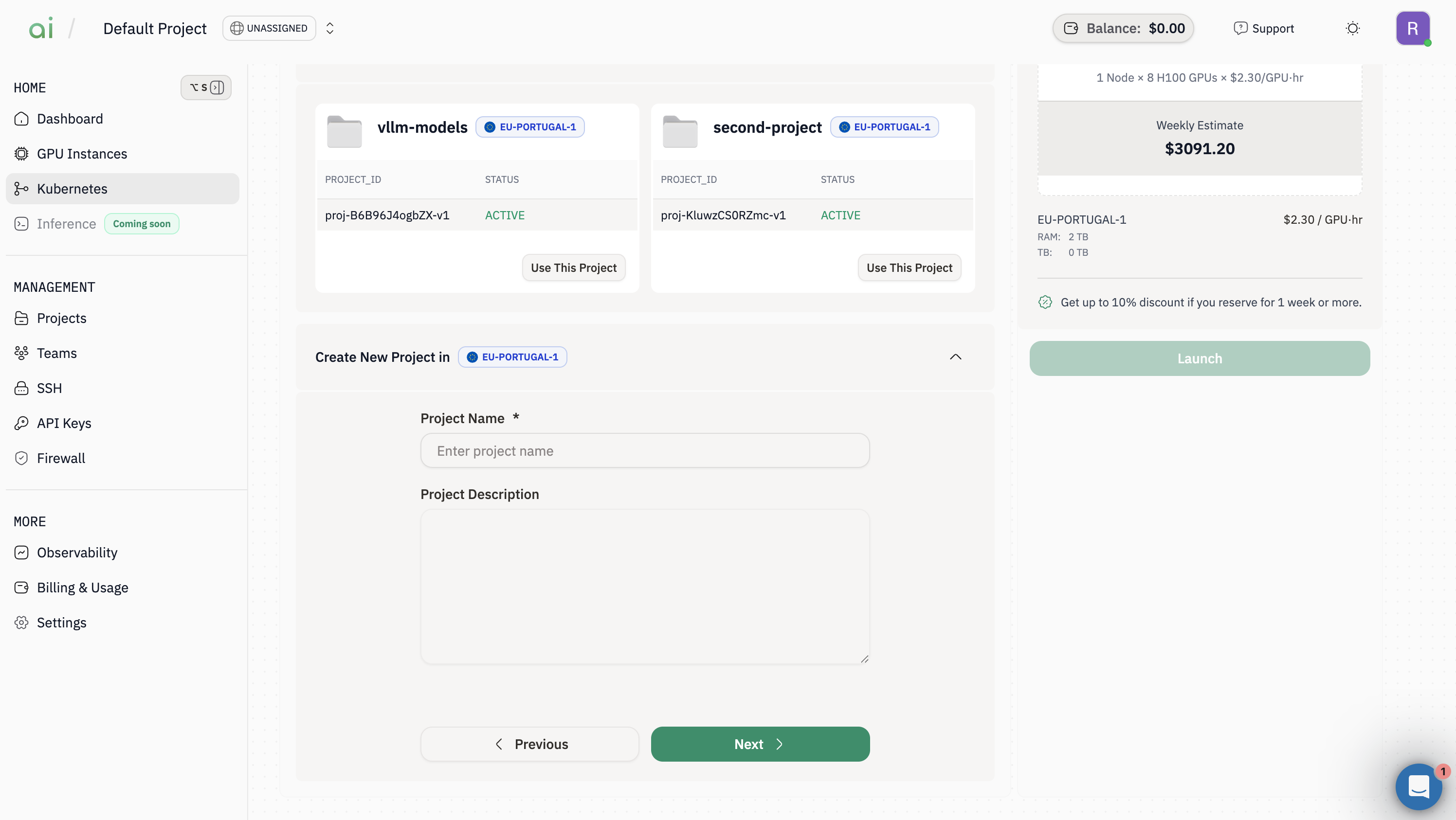 You must either pick an existing project or create a new one before launching a cluster.-