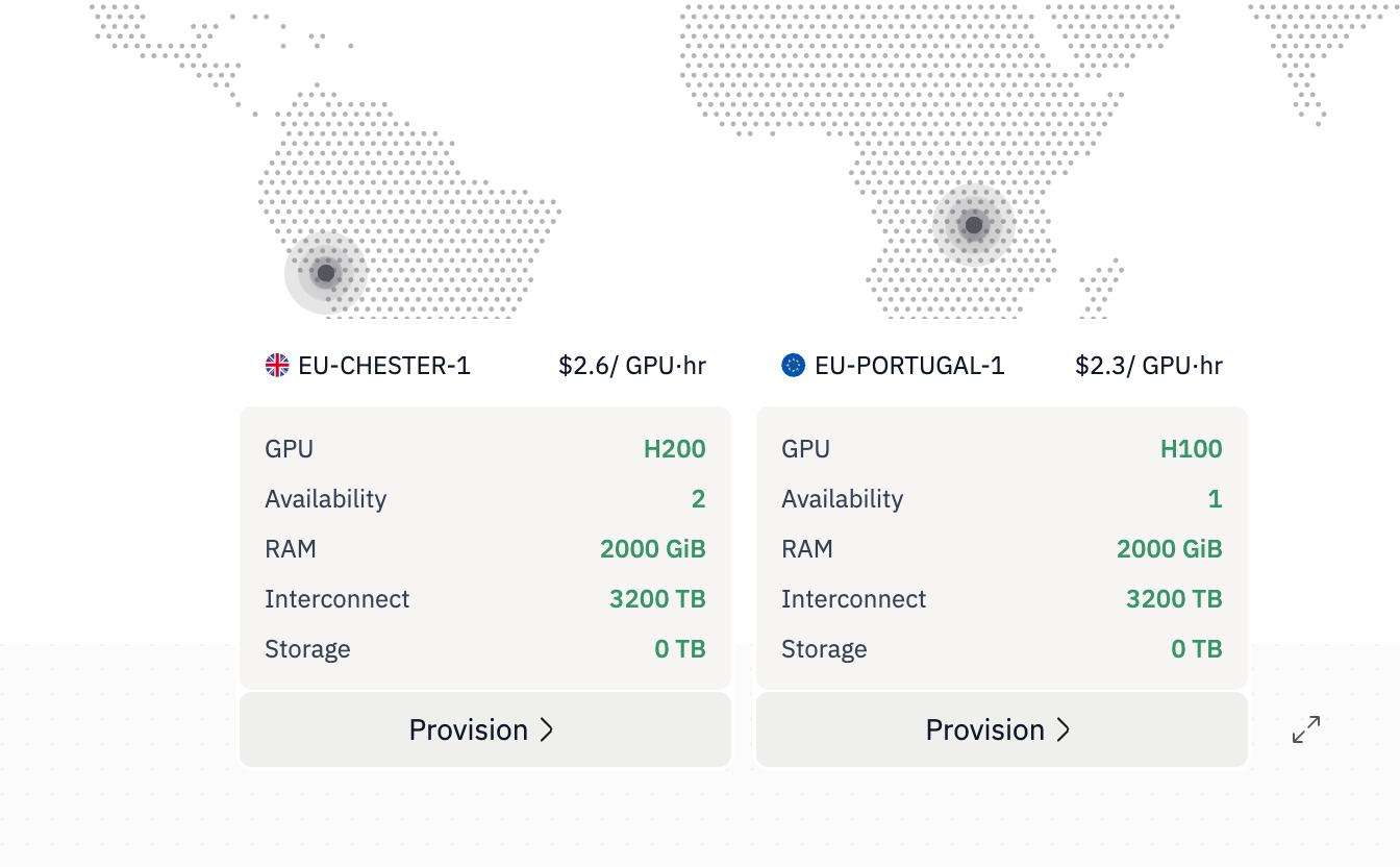 GPU type(H100, H200, etc.)AvailabilityRAM/Interconnect/StoragePrice per hour